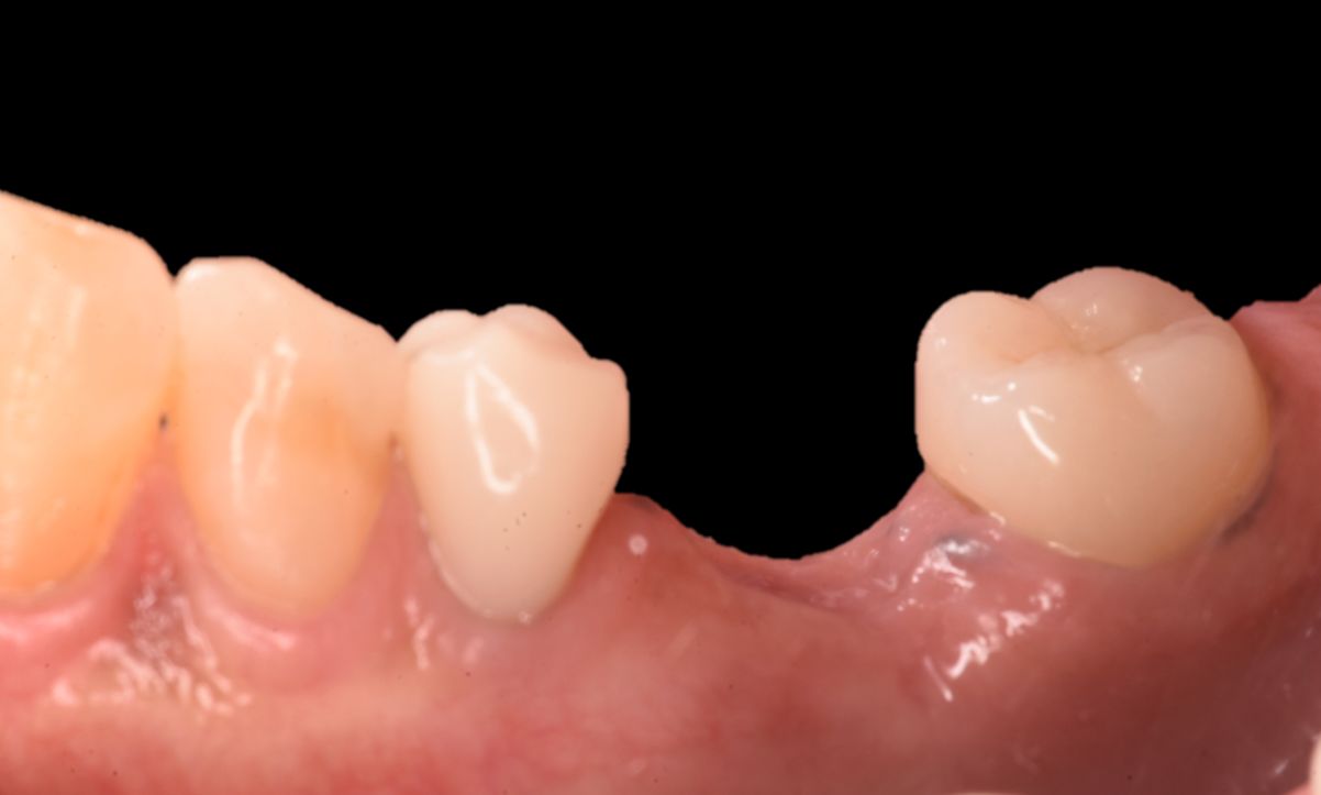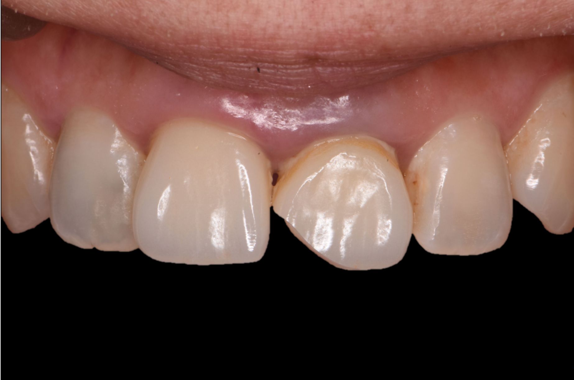 歯が欠けたと来院、検査後歯根破折診断。 抜歯と同時に即時インプラント埋入。 埋入時に歯肉の審美性を考慮し骨造成+結合組織移植術を同時に手術を 行い、機能面審美面共に回復しました。