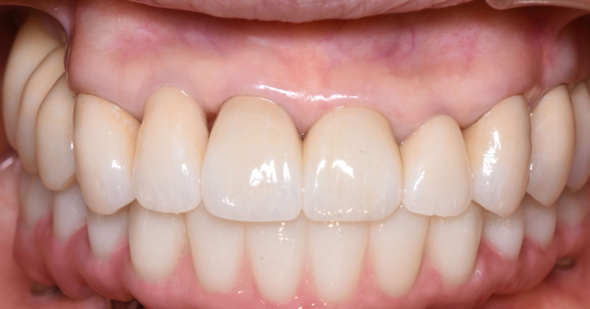 他院にて入れ歯を作製、使用してみたが使用感が苦手、インプラントにしたいと全顎的治療を希望で来院。 下顎は、インプラント6本で12本の歯を支える治療(オールオン6)、上顎は右上奥に2本、左上奥に1本インプラント、上顎前歯6本、臼歯2本はセラミック治療を行い機能面、審美面ともに患者様の希望にお答えすることができました。